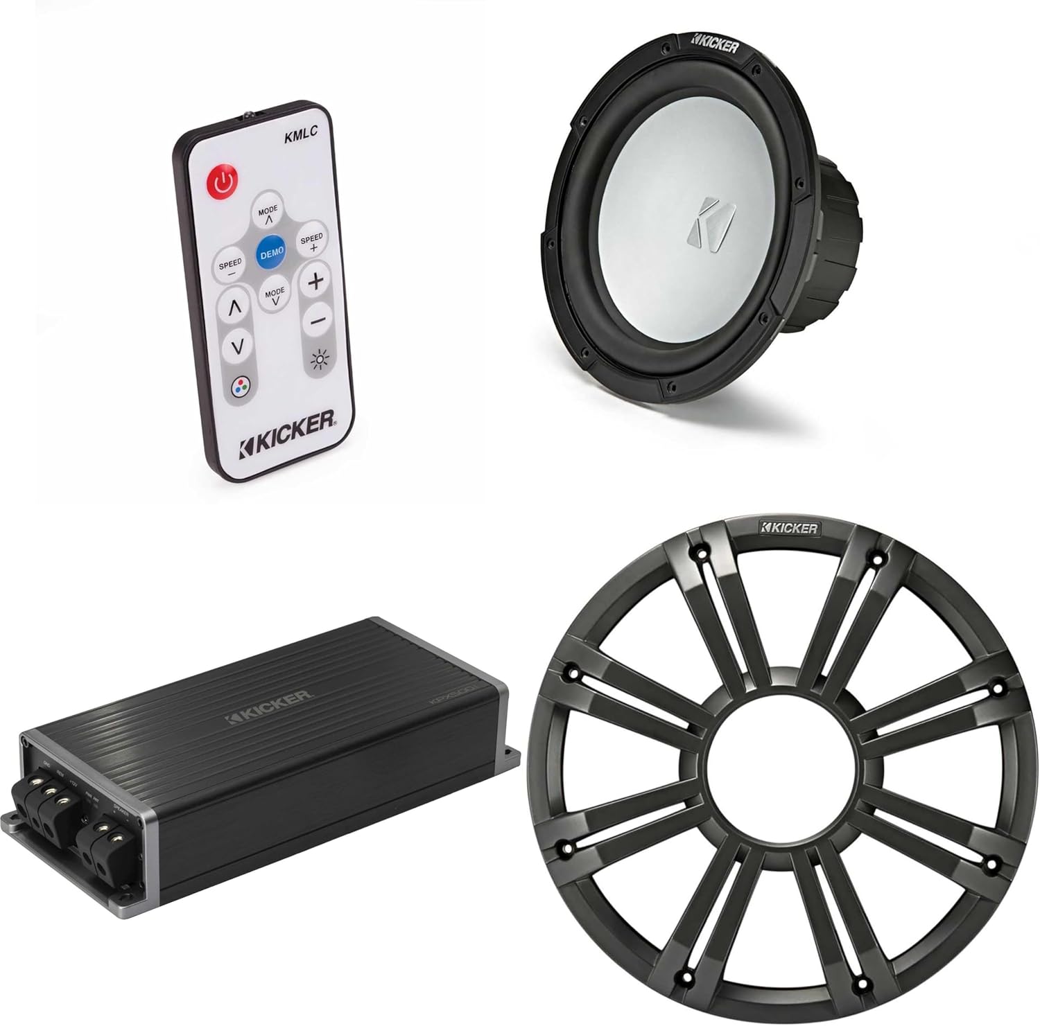 Kicker Marine KPX500.1 Powersports Amp & 10" Free Air 4 Ohm (Charcoal Grill) Subwoofer Audio Upgrade, Includes LED Remote