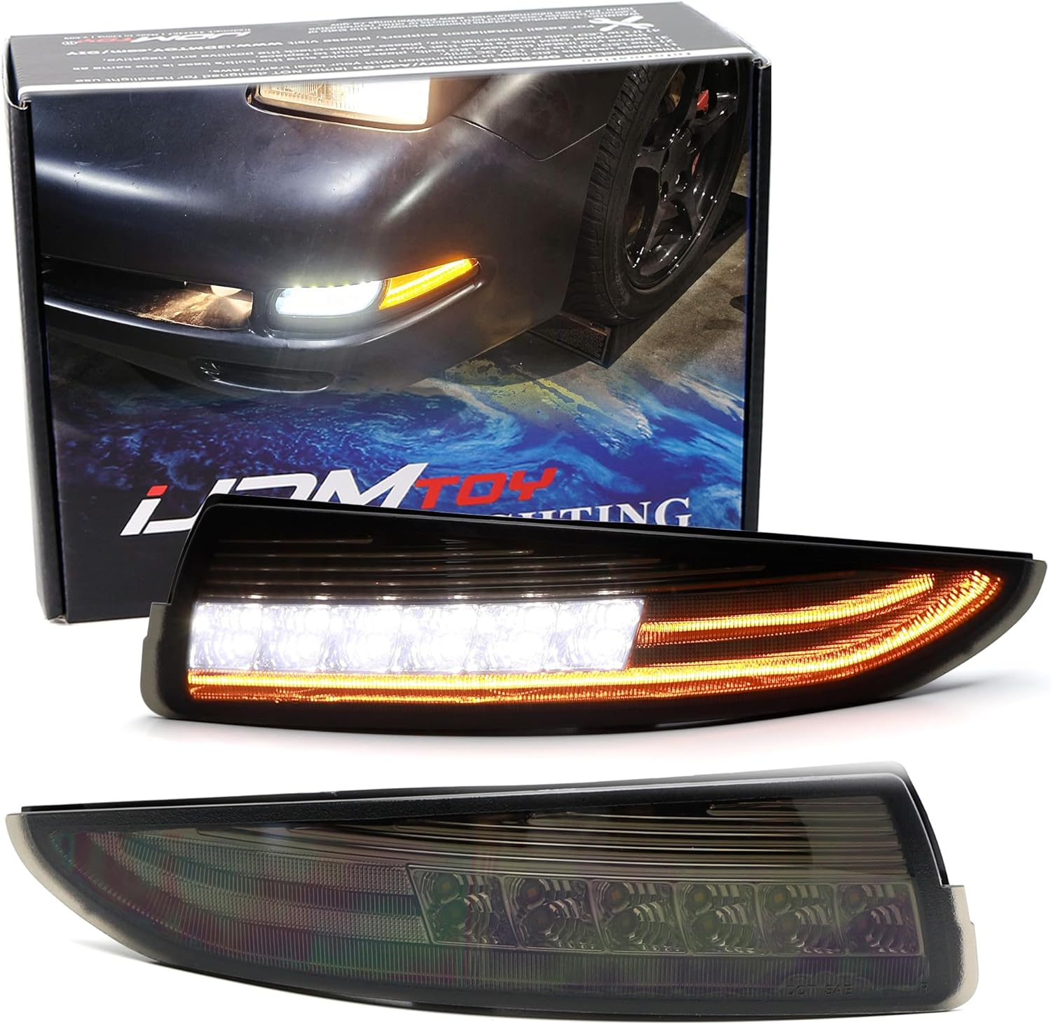 iJDMTOY Black-Out Smoked Lens LED DRL/Laser Sequential Front Turn Signal Light Assembly Compatible With 1993-2002 Chevrolet Camaro, Xenon White LED Parking/Driving & Full Amber LED Blinker