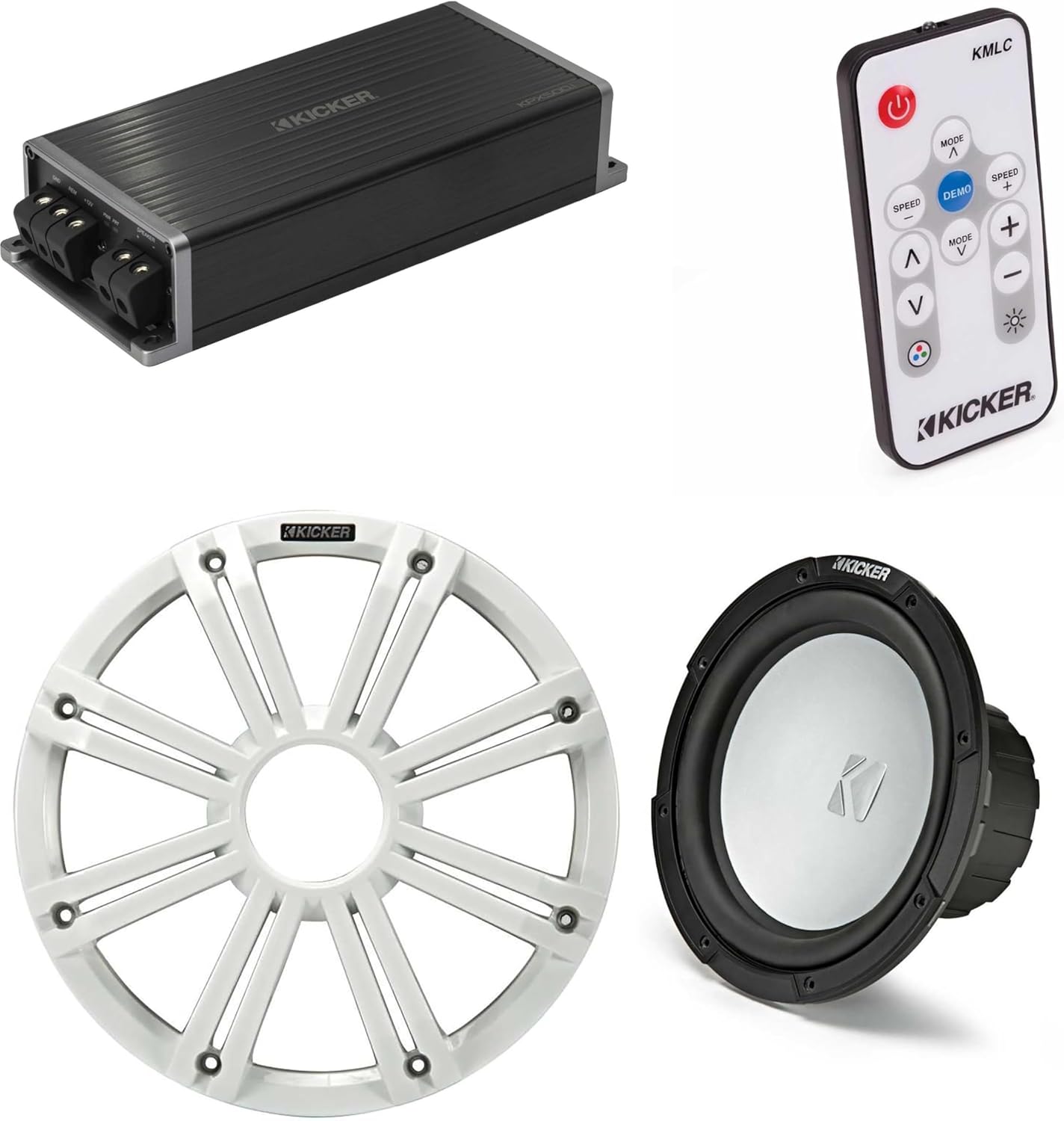 Kicker Marine KPX500.1 Powersports Amp & 10" Free Air 4 Ohm (White Grill) Subwoofer Audio Upgrade, Includes LED Remote