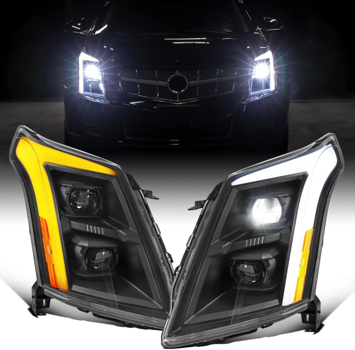 Ronnin - Fits 2010-2016 Cadillac SRX Upgrade For Halogen Type Full LED Dual Projector Headlights Switchback Sequential Turn Signals + Animated Startup Effect Pair | Black