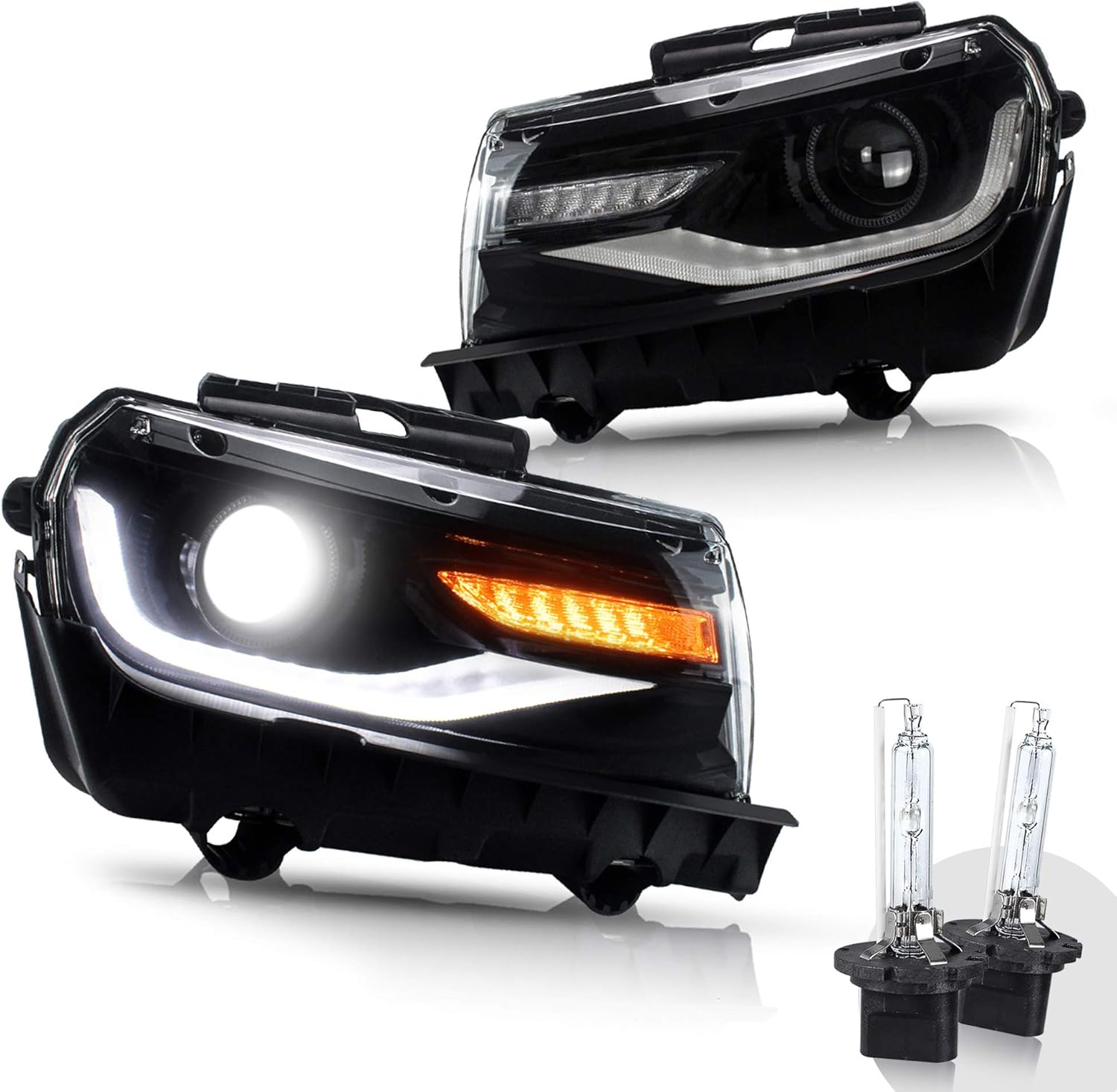 VLAND Projector LED Headlights & D2H Xenon Bulbs Compatible for [Chevy Camaro 5th Gen 2014 2015] with Sequential Turn Signal, Dual Beam Lens, Full LED DRL Bars YAA-CMR-0285 (Driver & Passenger Sides)