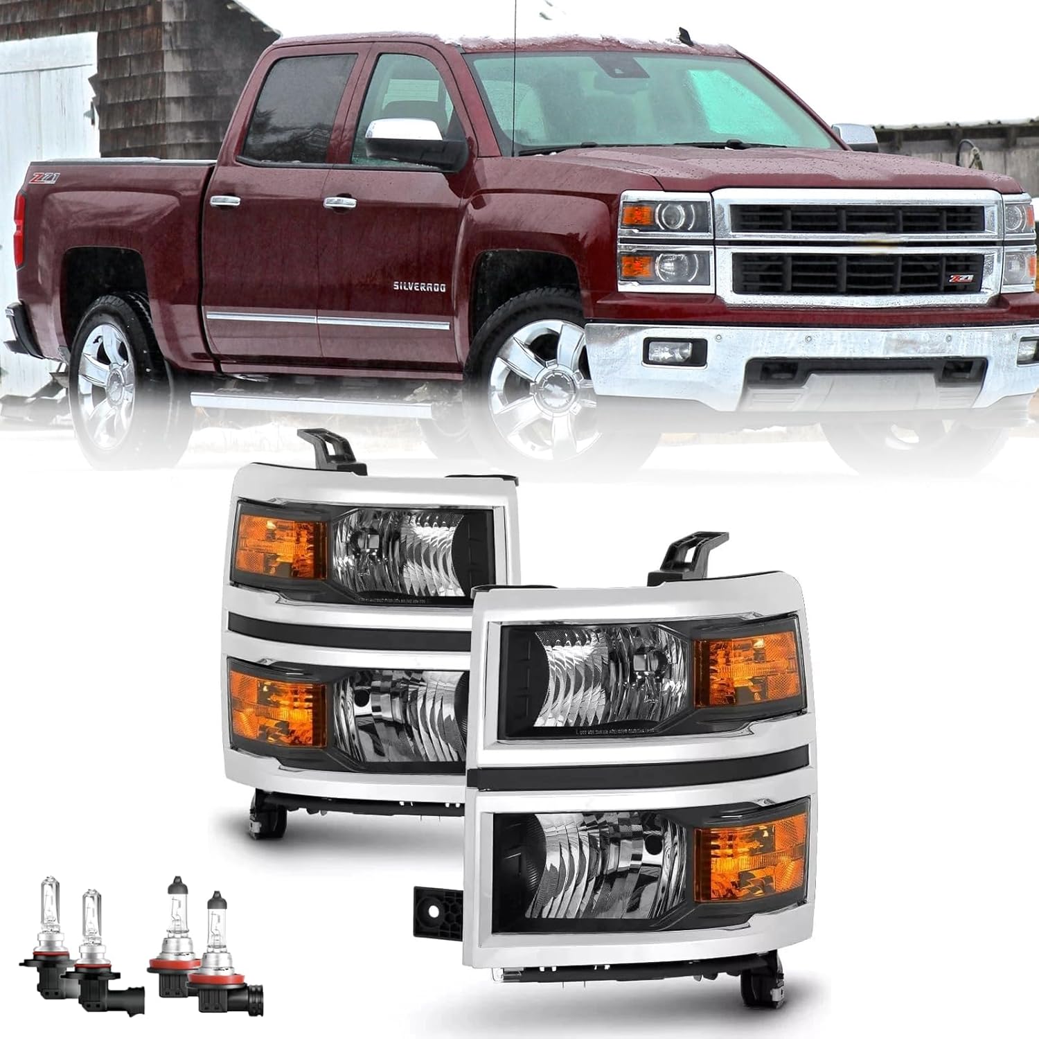 Headlight Assembly W/Bulbs Compatible with 2014-2015 Chevy Silverado 1500 Headlights Headlamps Left+Right 14-15 Lights (CHROME FRAME+BLACK INNER+AMBER SIDE)