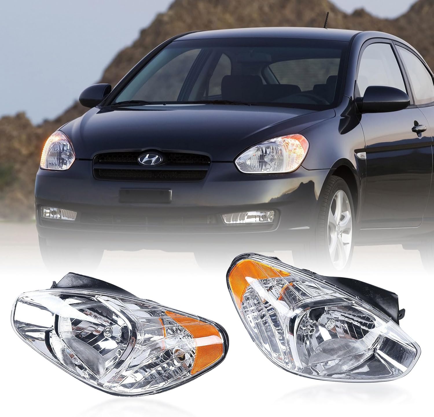For 2006 2007 2008 2009 2010 2011 Hyundai Accent Halogen Headlights Headlamps Black Housing Clear Lens 1 Pair (Left Side and Right Side)