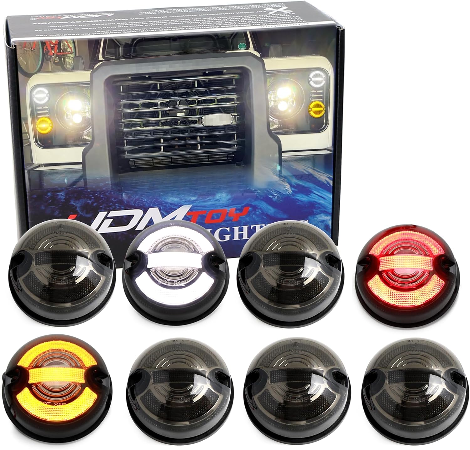 iJDMTOY 8pc Set OE-Size 73mm Diameter Black-Out Smoked Lens Amber/White/Red Full LED Front/Rear Turn Signal, Driving/Tail Brake Light Upgrading Kit Compatible With 1983-16 Land Rover Defender