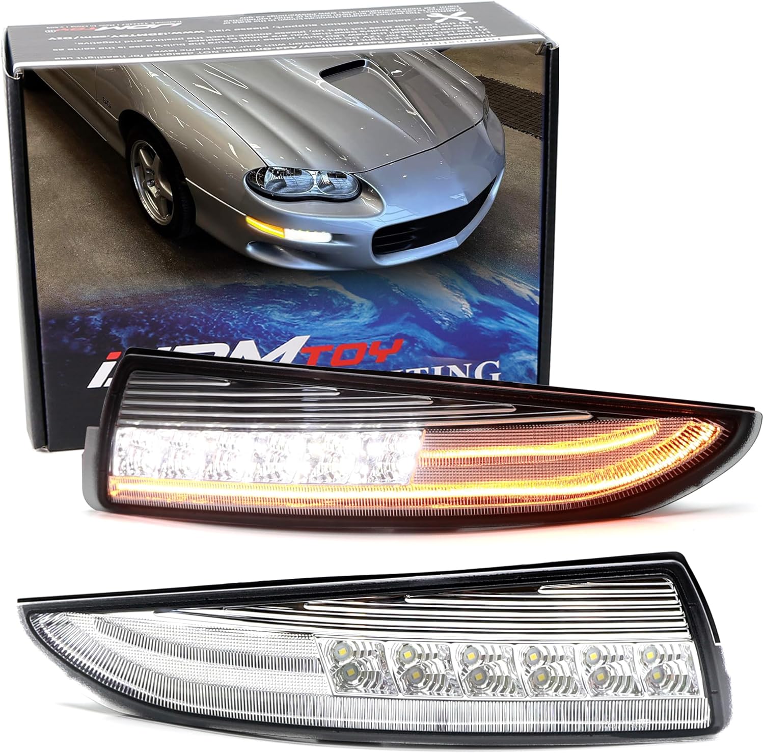iJDMTOY Semi-Clear Lens LED DRL/Laser Sequential Front Turn Signal Light Assembly Compatible With 1993-2002 Chevrolet Camaro, Xenon White LED Parking/Driving & Full Amber LED Blinker
