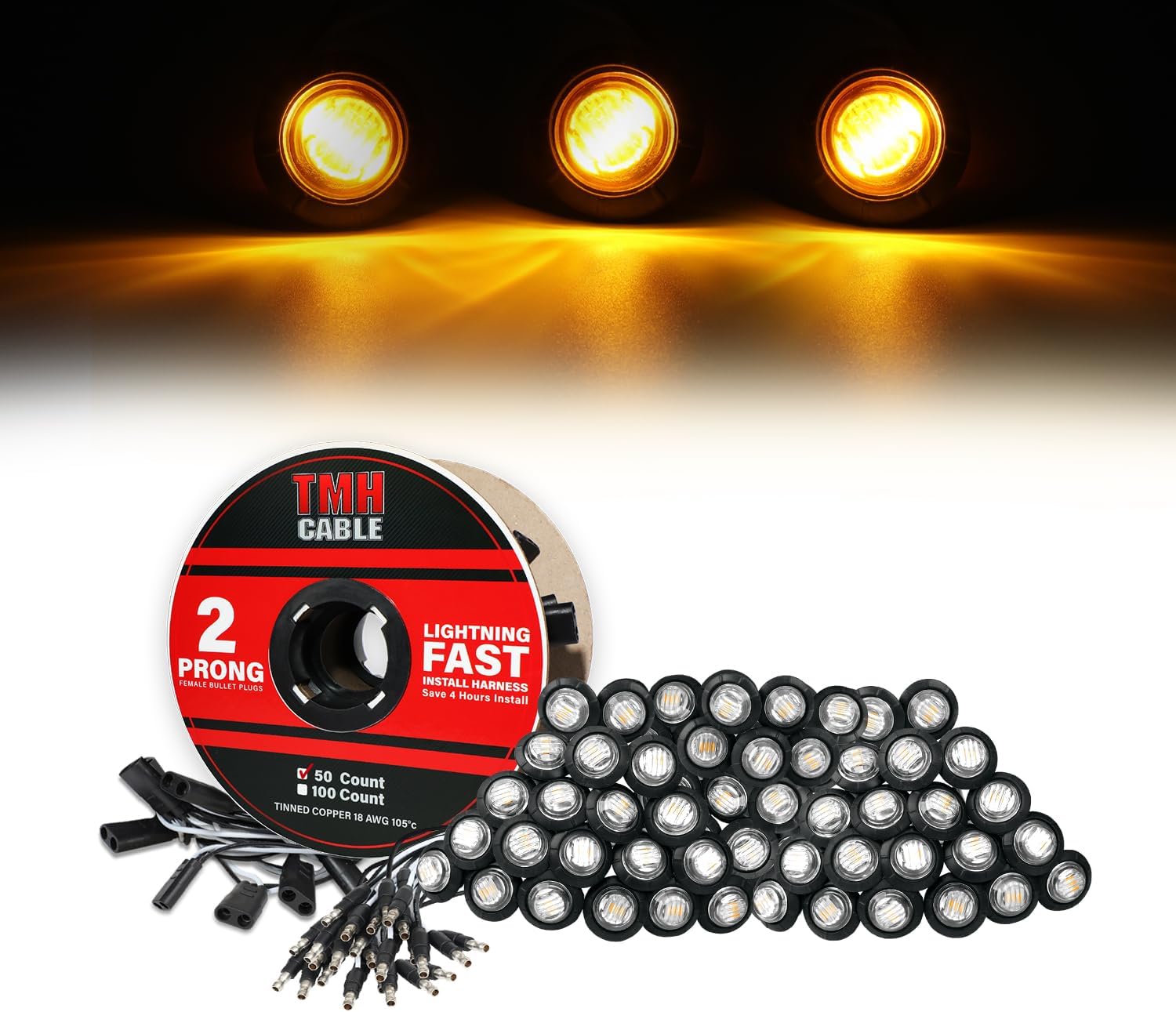 TMH 50 Pcs of 3/4 Inch Side Marker Clear Lens Amber Lights with Connector Plug + 2 Pin Continuous Wire Harness, Plug and Play Hassle-Free Installation for Truck Trailer RV Pickup