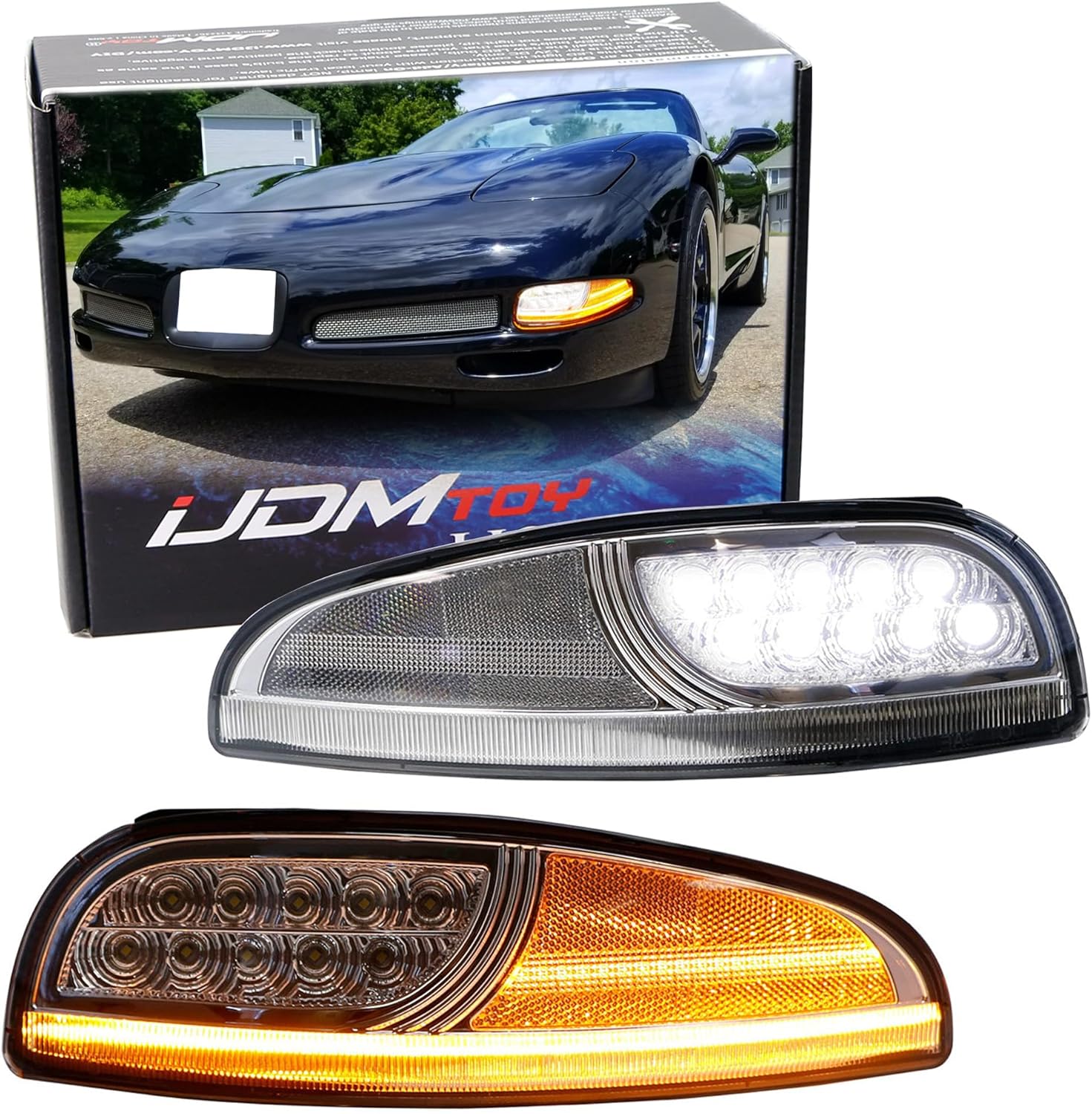 iJDMTOY Clear Lens LED DRL/Laser Sequential Front Turn Signal Light Assembly Compatible With 1997-2004 Chevrolet Corvette C5, Xenon White LED Parking/Driving & Full Amber LED Blinker