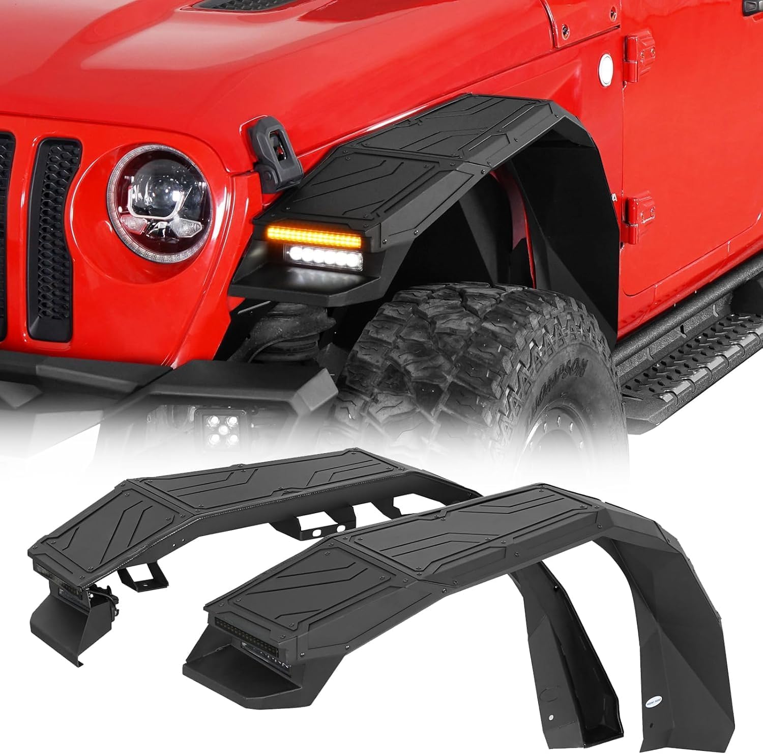 Hooke Road JL JT Aluminum Fender Flares w/Lights for 2018-2026 Jeep Wrangler JL & Gladiator JT, 2PCS High Clearance Front Fenders Mud Guards, Satin Black
