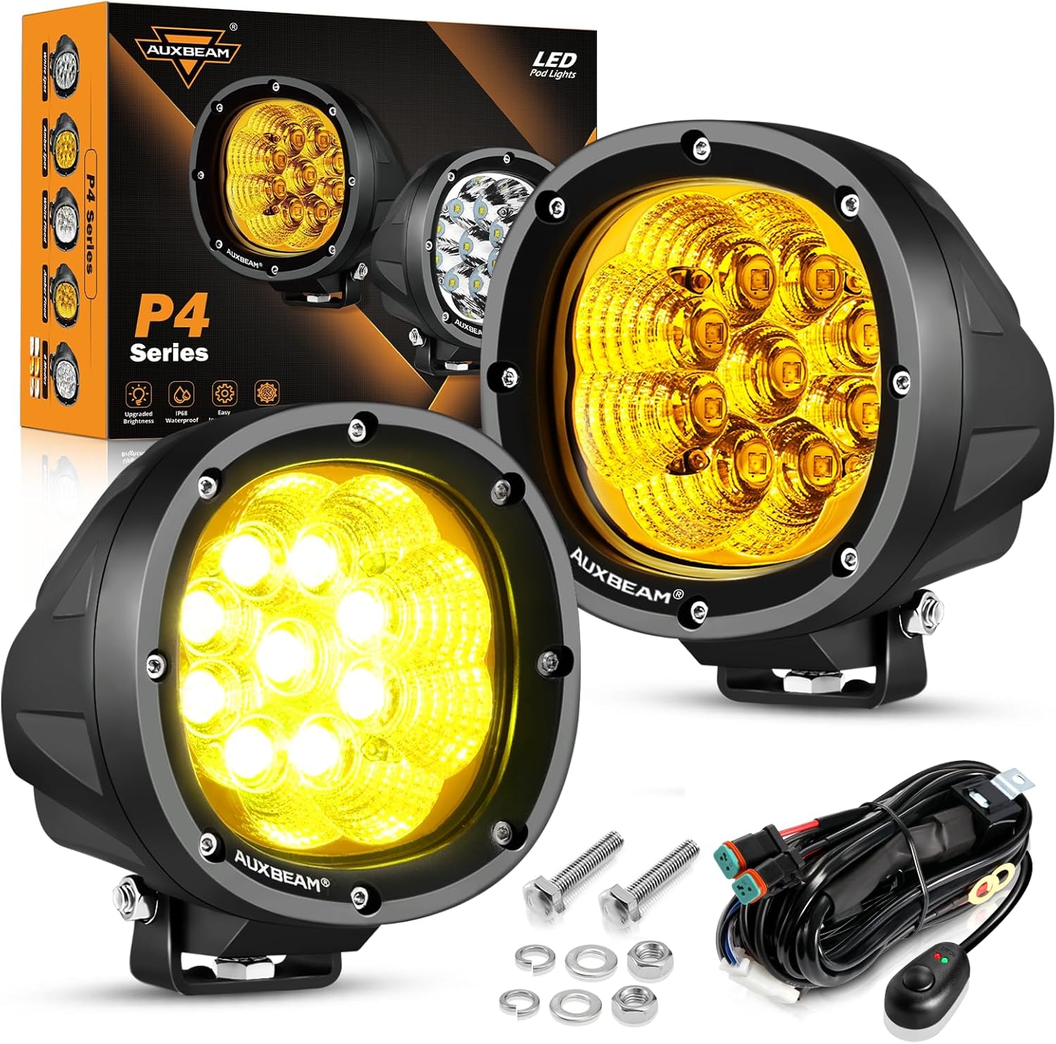 Auxbeam 4 Inch Amber Round LED Driving Light, 2PCS 90W 9000LM Yellow Fog Pods Light Bar Off-Road Flood Work Energy-Efficient Lights with DT Plug Wiring Harness Kit for Truck Jeep Pickup ATV UTV SUV
