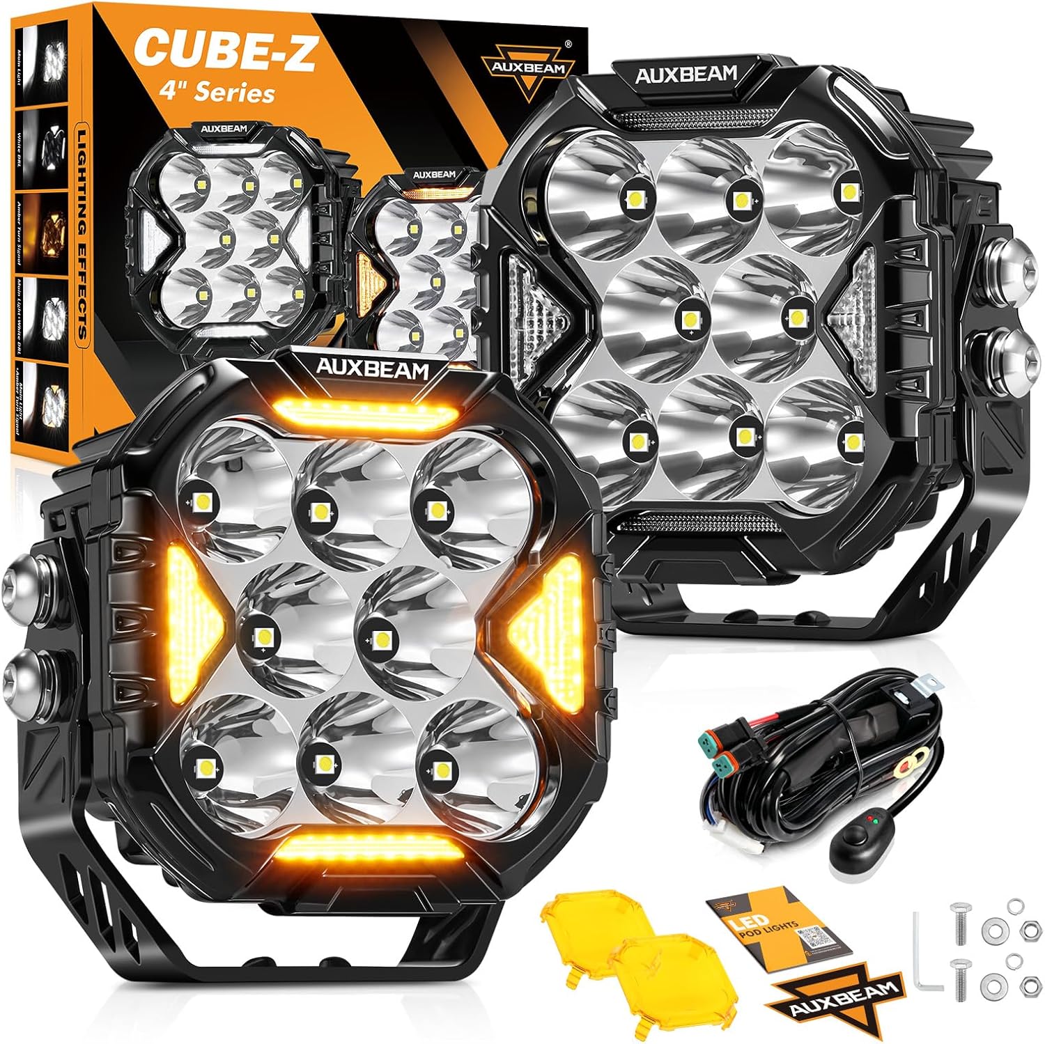 Auxbeam Cube-Z Series 4 Inch LED Pods Light, 112W Cube Offroad Driving Lights with White DRL&Amber Turn Signal Light, 12800LM Spot Beam Ditch Pod with Amber Covers & DT Wiring Harness for SUV ATV UTV