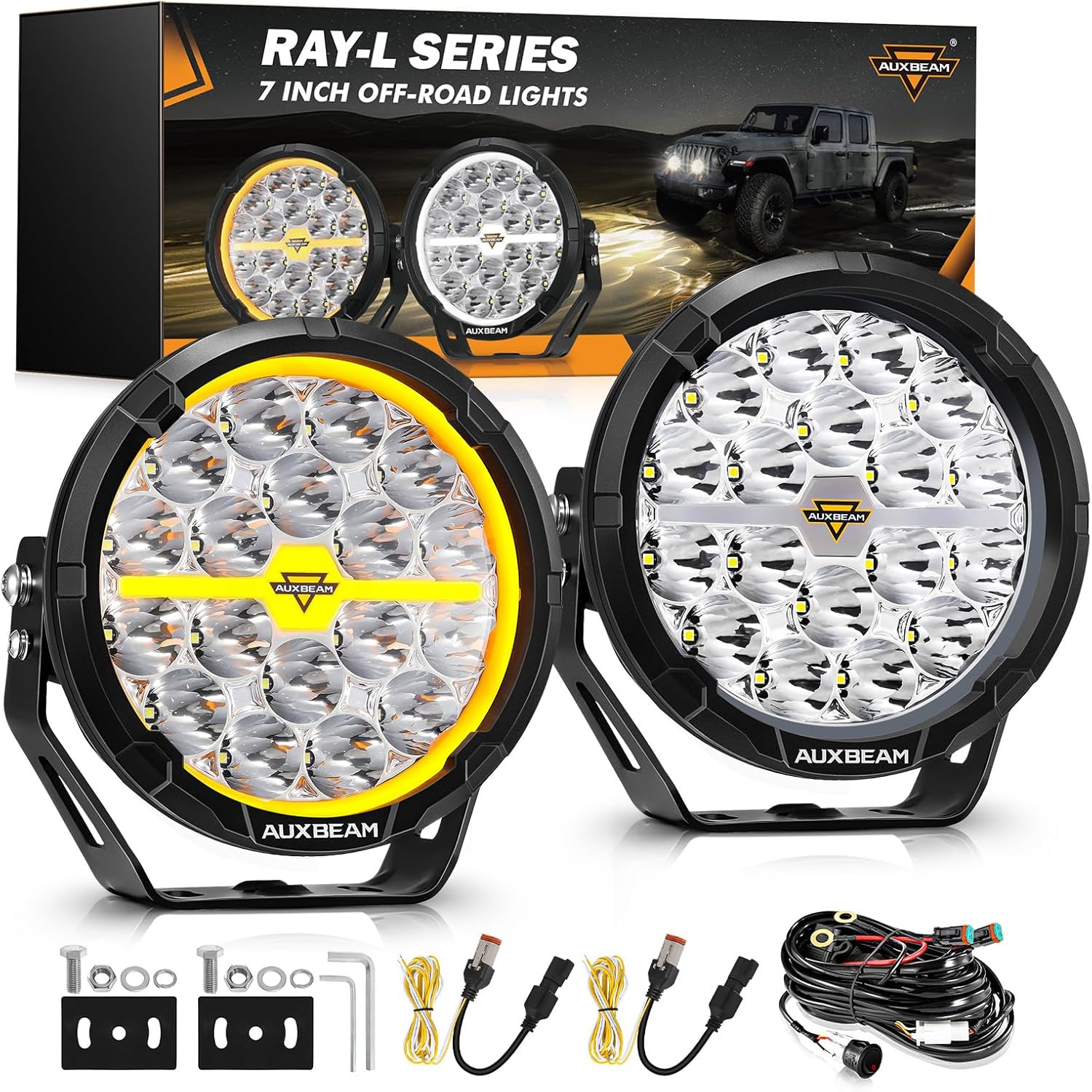 Auxbeam RAY-L Series 7 Inch Round LED Offroad Driving Light Bar with White/Amber DRL 240W Spot Beam Spotlights Offroad Lighting for 4x4 Jeep UTV ATV, Pair