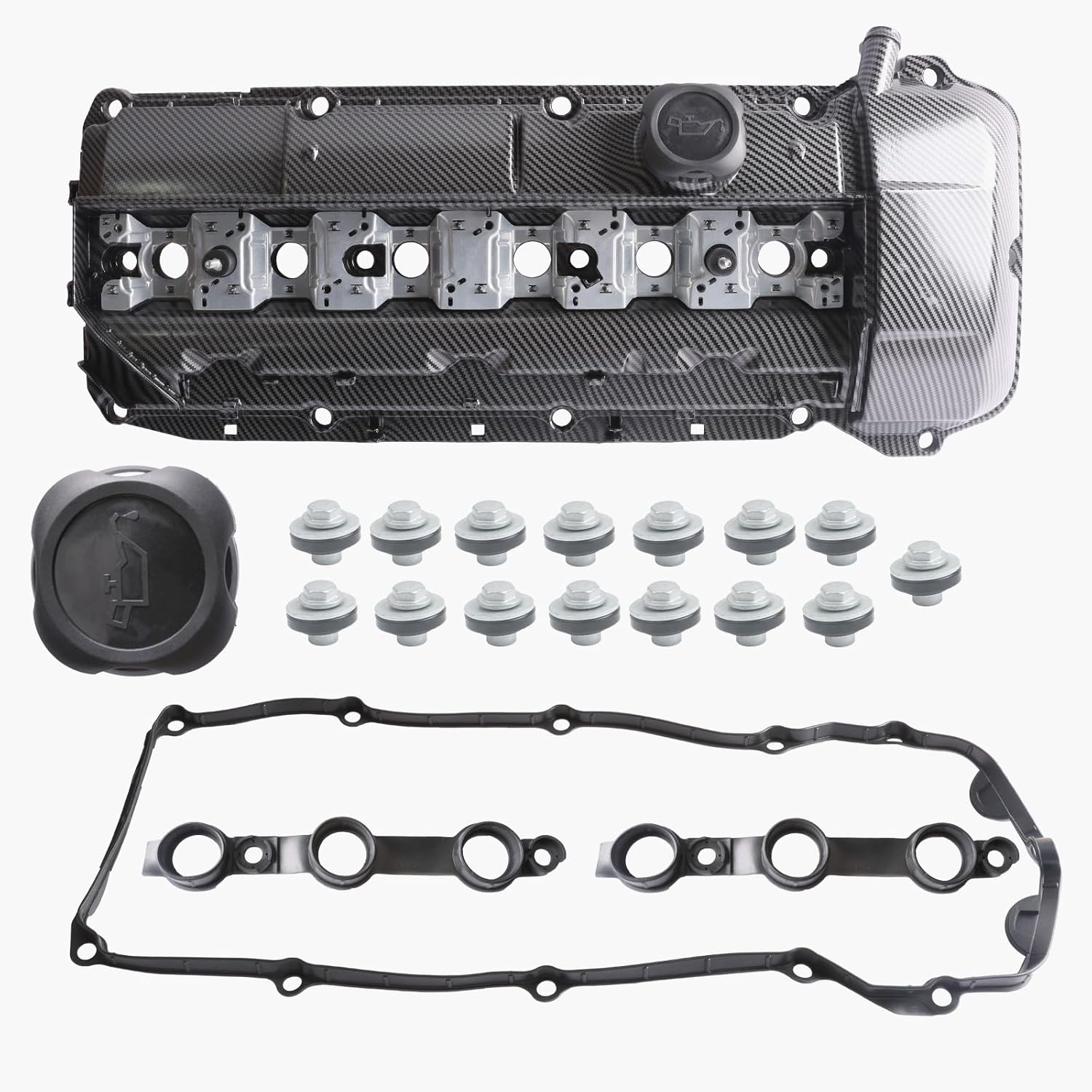 MITZONE Aluminum Valve Cover Kit Compatible with BMW 323i 323ci 325i 328i 330i 525i 528i 530i Z3 X5 M52 M54 1996-2000 2.5L 2.8L 3.0L Replace 11121432928 with Gasket Bolts & Cap, Carbon Strip Cover