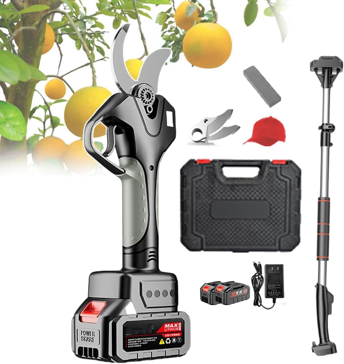 Electric Pruning Shears 21V Cordless, Professional Secateurs with Telescopic Pole,Battery-Powered, Includes Gloves, Sunhat, and Charger