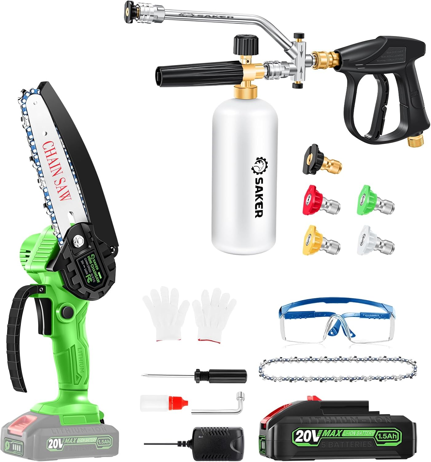 Saker Mini Chainsaw|6 Inch Chainsaw AND Saker Foam Cannon Dual Connector Accessory for Pressure Washer Kit